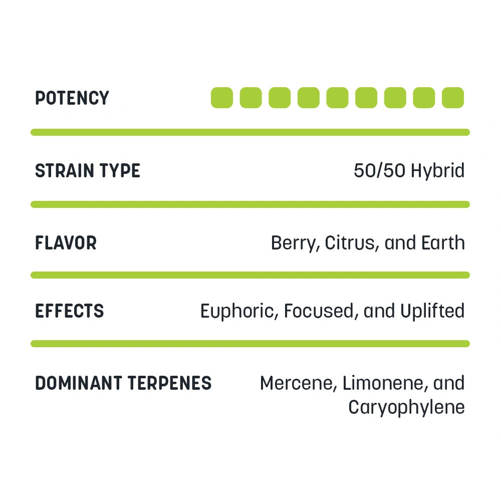 About the strain: Blockberry is a flavorful cross between Black Cherry Punch and Tropicanna Cookies, often praised for its sweet, dessert-like profile. It’s commonly associated with ripe blueberry flavors layered with hints of citrus, vanilla, and herb. Users report a quick rush of euphoria that settles into steady, creative energy, helping maintain focus without feeling heavy. With its bright effects and smooth flavor, Blockberry is often considered a perfect choice for daytime use.