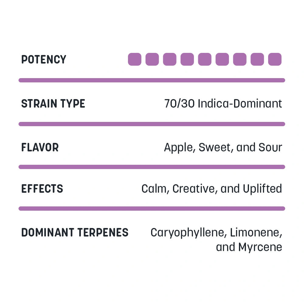 About the strain: Cosmic Crisp is a sweet cross between Triangle Mints and Apple Fritter, often picked for winding down after a long, stressful day. Users report a quick boost of euphoria that brings a happy, focused energy before easing into a light physical calm without feeling overly sleepy. Flavor-wise, it’s commonly described as sugary vanilla with tangy, sour apple twists—like biting into a warm apple cake. With its smooth balance of uplift and relaxation, Cosmic Crisp is a great choice for late-afternoon or evening sessions when you want to unwind but stay clear-headed.