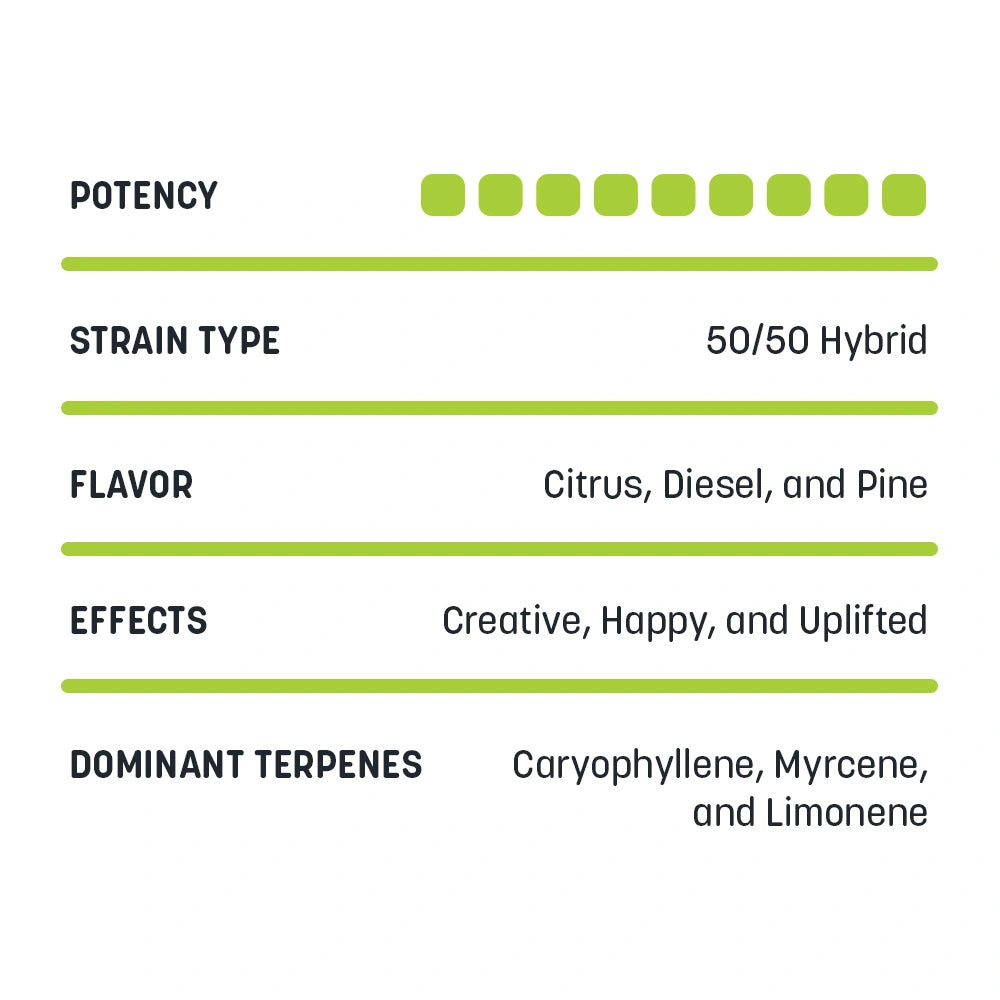 Chem 91 (also known as 91 Chemdawg) is a hybrid often chosen for daytime or early-morning sessions when you want to feel awake and switched on. Users report an immediate uplift on the exhale, bringing a clear-headed boost of creative energy and motivation. As the effects build, many describe a blissful, feel-good mindset that helps quiet mental stress and keeps the mood light. Flavor-wise, Chem 91 is commonly associated with strong chemical notes layered with earthy diesel and a citrusy finish.