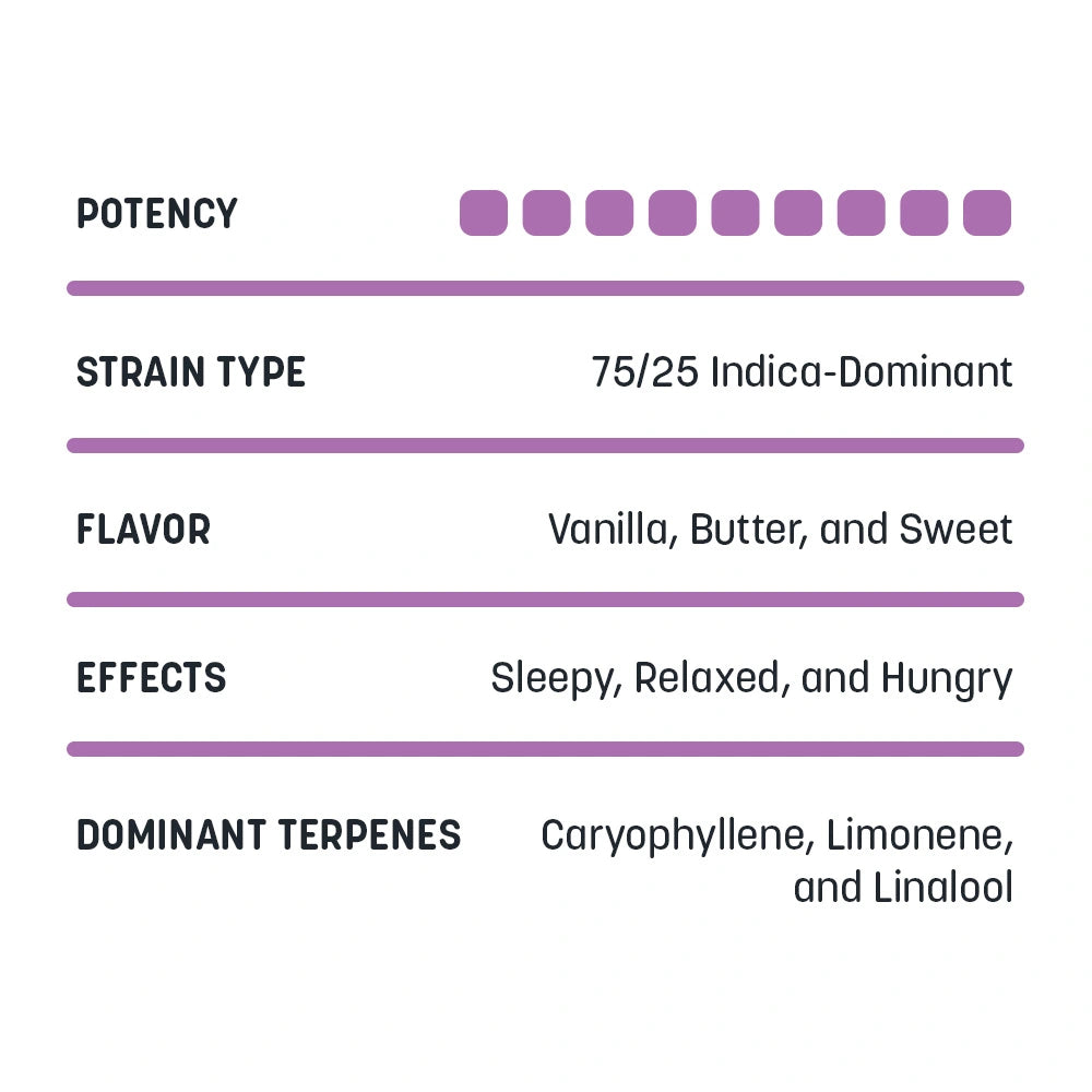 Ice Cream Cake is believed to be a cross of Wedding Cake and Gelato #33. Giving sweet and creamy flavors, with hints of vanilla, sugary dough, and earthy undertones, Ice Cream Cake has been said to offer a deeply relaxing high that calms negative thoughts, lifts one's mood, and relaxes the body into a couch-lock. Users report the strain is perfect for a great night’s sleep.