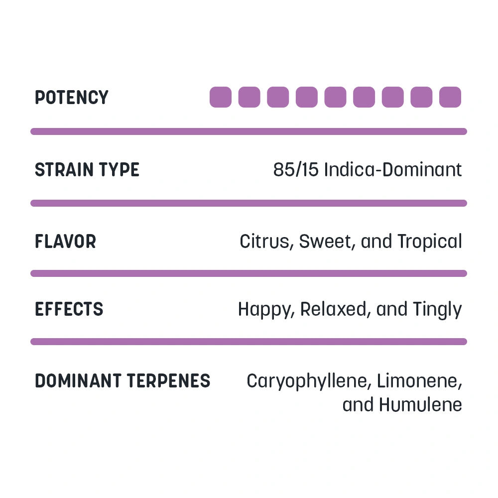 Sherbert is an indica-dominant hybrid born from Girl Scout Cookies and Pink Panties said to hit like dessert in the best possible way. Its flavor is known to serve up a sweet, tropical medley with a bright citrus pop, keeping every hit fresh and indulgent. Users often report a mood-lifting wave of happiness melting into full-body relaxation with a pleasant tingly buzz that keeps things comfortable without putting you out. Sherbert is said to be the perfect dessert strain for winding down after a long day while keeping the vibes good.