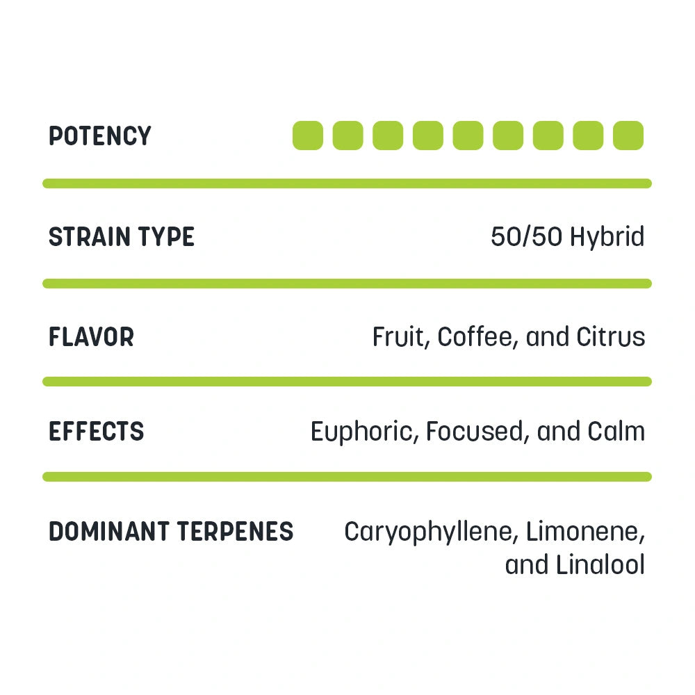Z-spresso is a hybrid of unknown lineage, often described as a dessert-like strain with sweet citrus and roasted coffee flavors. Users report feeling bright, happy, and motivated after a session, making it easier to knock out tasks without feeling overwhelmed. Many also describe a calm, relaxed body feel that stays light and doesn’t lean too sedating. With its upbeat vibe and cozy flavor, Z-spresso may make a great afternoon pick-me-up.
